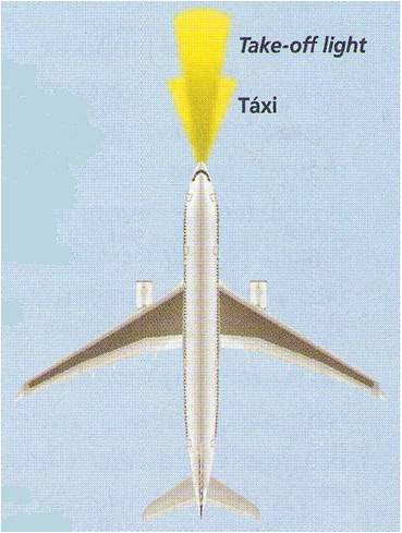 No nariz da aeronave existem duas lâmpadas incandescentes acomodadas na parte superior do trem de pouso. A de táxi e a de “take-off light (T.O.)” ou decolagem. A de táxi é utilizada exclusivamente para o táxi, tem 450 watts e produz um feixe luminoso com ângulo maior e foco mais próximo. A T.O. é útil principalmente na decolagem, suporta 600 watts e ilumina uma área com ângulo menor e foco mais longo. Após a retração do trem de pouso, as lâmpadas são desligadas automaticamente. Durante o dia, as luzes normalmente permanecem desligadas.